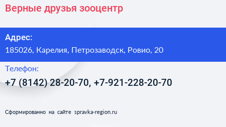 Верные друзья, зооцентр по адресу 185026, Карелия, Петрозаводск, Ровио, 20 в дальнейшем Организация, размещена в следующих категориях: