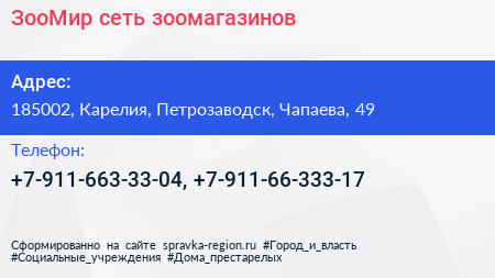 ЗооМир, сеть зоомагазинов по адресу 185002, Карелия, Петрозаводск, Чапаева, 49 в дальнейшем Организация, размещена в следующих категориях: