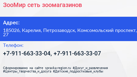 ЗооМир, сеть зоомагазинов по адресу 185026, Карелия, Петрозаводск, Комсомольский проспект, 27 в дальнейшем Организация, размещена в следующих категориях: