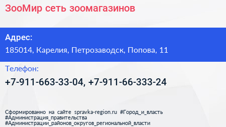 ЗооМир, сеть зоомагазинов по адресу 185014, Карелия, Петрозаводск, Попова, 11 в дальнейшем Организация, размещена в следующих категориях:
