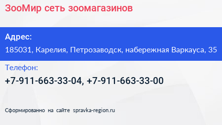 ЗооМир, сеть зоомагазинов по адресу 185031, Карелия, Петрозаводск, набережная Варкауса, 35 в дальнейшем Организация, размещена в следующих категориях: