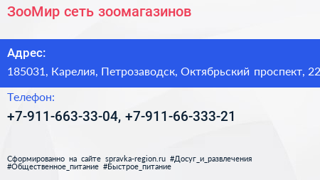 ЗооМир, сеть зоомагазинов по адресу 185031, Карелия, Петрозаводск, Октябрьский проспект, 22 в дальнейшем Организация, размещена в следующих категориях: