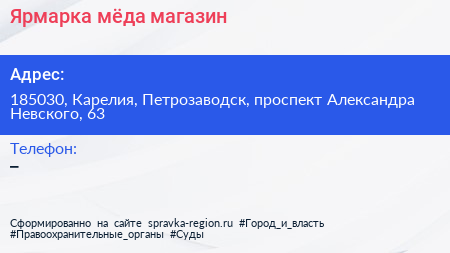 Ярмарка мёда, магазин по адресу 185030, Карелия, Петрозаводск, проспект Александра Невского, 63 в дальнейшем Организация, размещена в следующих категориях: