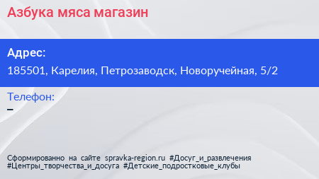 Азбука мяса, магазин по адресу 185501, Карелия, Петрозаводск, Новоручейная, 5/2 в дальнейшем Организация, размещена в следующих категориях: