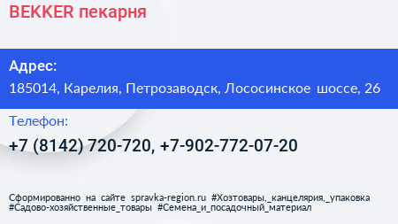 BEKKER, пекарня по адресу 185014, Карелия, Петрозаводск, Лососинское шоссе, 26 в дальнейшем Организация, размещена в следующих категориях: