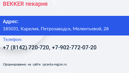 BEKKER, пекарня по адресу 185031, Карелия, Петрозаводск, Мелентьевой, 28 в дальнейшем Организация, размещена в следующих категориях:
