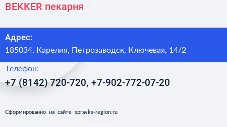 BEKKER, пекарня по адресу 185034, Карелия, Петрозаводск, Ключевая, 14/2 в дальнейшем Организация, размещена в следующих категориях: