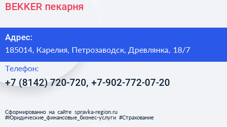 BEKKER, пекарня по адресу 185014, Карелия, Петрозаводск, Древлянка, 18/7 в дальнейшем Организация, размещена в следующих категориях: