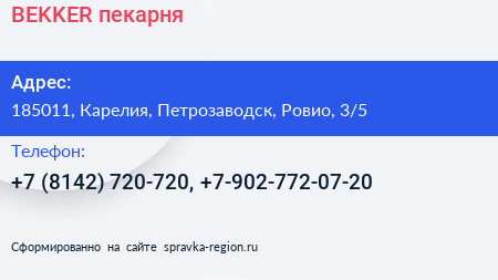 BEKKER, пекарня по адресу 185011, Карелия, Петрозаводск, Ровио, 3/5 в дальнейшем Организация, размещена в следующих категориях: