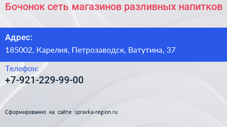Бочонок, сеть магазинов разливных напитков по адресу 185002, Карелия, Петрозаводск, Ватутина, 37 в дальнейшем Организация, размещена в следующих категориях: