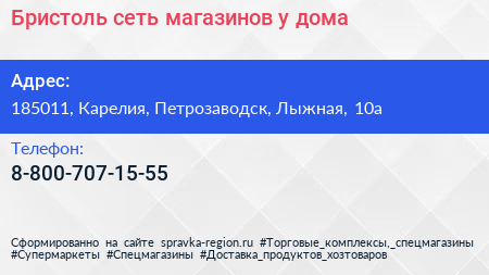 Бристоль, сеть магазинов у дома по адресу 185011, Карелия, Петрозаводск, Лыжная, 10а в дальнейшем Организация, размещена в следующих категориях: