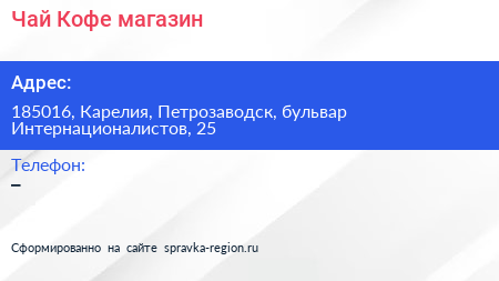 Чай&Кофе, магазин по адресу 185016, Карелия, Петрозаводск, бульвар Интернационалистов, 25 в дальнейшем Организация, размещена в следующих категориях:
