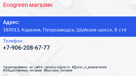 Ecogreen, магазин по адресу 185013, Карелия, Петрозаводск, Шуйское шоссе, 8 ст6 в дальнейшем Организация, размещена в следующих категориях: