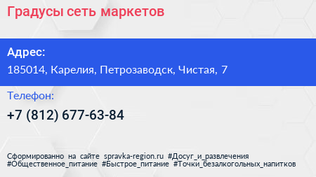 Градусы, сеть маркетов по адресу 185014, Карелия, Петрозаводск, Чистая, 7 в дальнейшем Организация, размещена в следующих категориях: