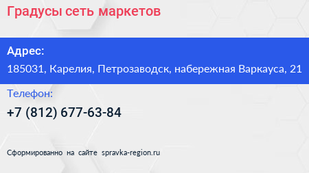 Градусы, сеть маркетов по адресу 185031, Карелия, Петрозаводск, набережная Варкауса, 21 в дальнейшем Организация, размещена в следующих категориях: