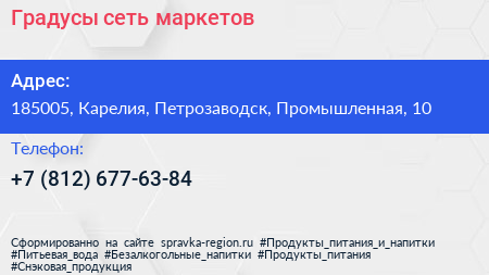 Градусы, сеть маркетов по адресу 185005, Карелия, Петрозаводск, Промышленная, 10 в дальнейшем Организация, размещена в следующих категориях: