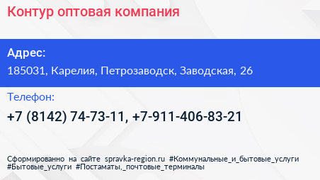 Контур, оптовая компания по адресу 185031, Карелия, Петрозаводск, Заводская, 26 в дальнейшем Организация, размещена в следующих категориях: