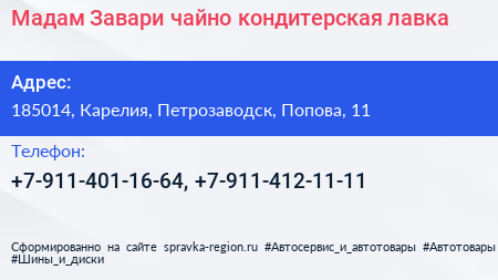 Мадам Завари, чайно-кондитерская лавка по адресу 185014, Карелия, Петрозаводск, Попова, 11 в дальнейшем Организация, размещена в следующих категориях: