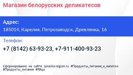 Магазин белорусских деликатесов по адресу 185014, Карелия, Петрозаводск, Древлянка, 16 в дальнейшем Организация, размещена в следующих категориях: