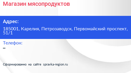 Магазин мясопродуктов по адресу 185001, Карелия, Петрозаводск, Первомайский проспект, 51/1 в дальнейшем Организация, размещена в следующих категориях:
