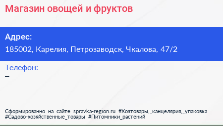 Магазин овощей и фруктов по адресу 185002, Карелия, Петрозаводск, Чкалова, 47/2 в дальнейшем Организация, размещена в следующих категориях: