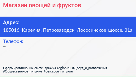 Магазин овощей и фруктов по адресу 185016, Карелия, Петрозаводск, Лососинское шоссе, 31а в дальнейшем Организация, размещена в следующих категориях: