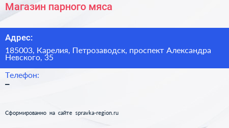 Магазин парного мяса по адресу 185003, Карелия, Петрозаводск, проспект Александра Невского, 35 в дальнейшем Организация, размещена в следующих категориях: