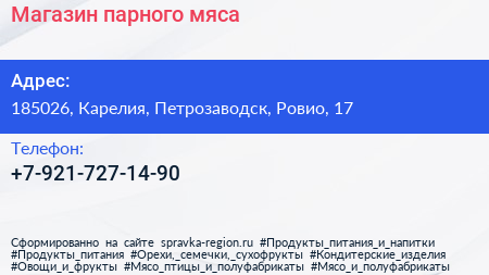Магазин парного мяса по адресу 185026, Карелия, Петрозаводск, Ровио, 17 в дальнейшем Организация, размещена в следующих категориях: