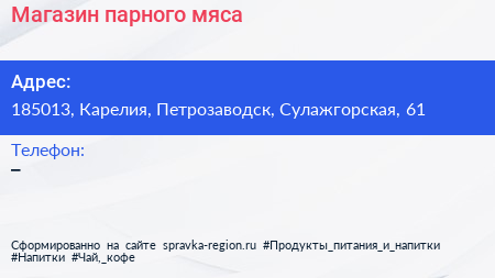 Магазин парного мяса по адресу 185013, Карелия, Петрозаводск, Сулажгорская, 61 в дальнейшем Организация, размещена в следующих категориях: