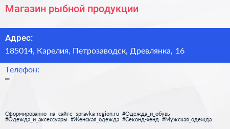 Магазин рыбной продукции по адресу 185014, Карелия, Петрозаводск, Древлянка, 16 в дальнейшем Организация, размещена в следующих категориях: