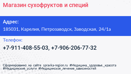 Магазин сухофруктов и специй по адресу 185031, Карелия, Петрозаводск, Заводская, 24/1а в дальнейшем Организация, размещена в следующих категориях: