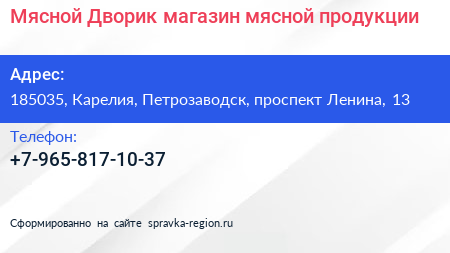 Мясной Дворик, магазин мясной продукции по адресу 185035, Карелия, Петрозаводск, проспект Ленина, 13 в дальнейшем Организация, размещена в следующих категориях: