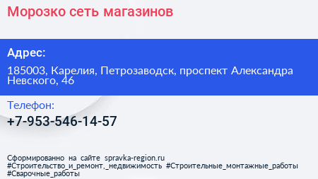 Морозко, сеть магазинов по адресу 185003, Карелия, Петрозаводск, проспект Александра Невского, 46 в дальнейшем Организация, размещена в следующих категориях: