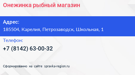 Онежинка, рыбный магазин по адресу 185504, Карелия, Петрозаводск, Школьная, 1 в дальнейшем Организация, размещена в следующих категориях: