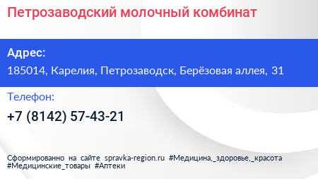 Петрозаводский молочный комбинат по адресу 185014, Карелия, Петрозаводск, Берёзовая аллея, 31 в дальнейшем Организация, размещена в следующих категориях: