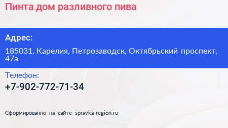 Пинта, дом разливного пива по адресу 185031, Карелия, Петрозаводск, Октябрьский проспект, 47а в дальнейшем Организация, размещена в следующих категориях: