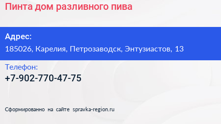 Пинта, дом разливного пива по адресу 185026, Карелия, Петрозаводск, Энтузиастов, 13 в дальнейшем Организация, размещена в следующих категориях: