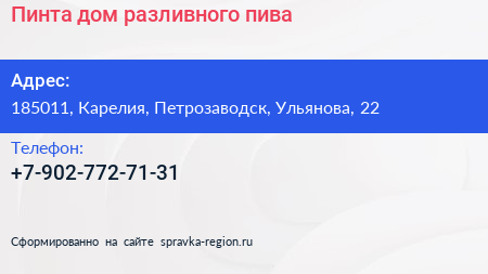 Пинта, дом разливного пива по адресу 185011, Карелия, Петрозаводск, Ульянова, 22 в дальнейшем Организация, размещена в следующих категориях: