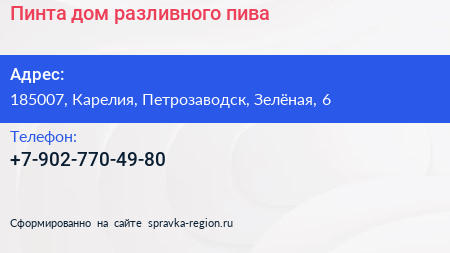 Пинта, дом разливного пива по адресу 185007, Карелия, Петрозаводск, Зелёная, 6 в дальнейшем Организация, размещена в следующих категориях: