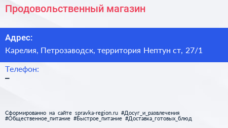 Продовольственный магазин по адресу Карелия, Петрозаводск, территория Нептун ст, 27/1 в дальнейшем Организация, размещена в следующих категориях: