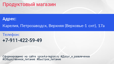 Продуктовый магазин по адресу Карелия, Петрозаводск, Верхняя (Верховье-1 снт), 17а в дальнейшем Организация, размещена в следующих категориях: