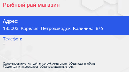 Рыбный рай, магазин по адресу 185003, Карелия, Петрозаводск, Калинина, 8/6 в дальнейшем Организация, размещена в следующих категориях: