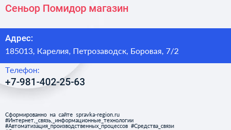 Сеньор Помидор, магазин по адресу 185013, Карелия, Петрозаводск, Боровая, 7/2 в дальнейшем Организация, размещена в следующих категориях: