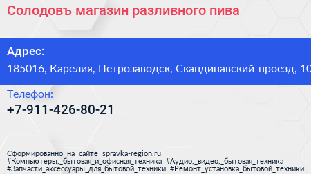 Солодовъ, магазин разливного пива по адресу 185016, Карелия, Петрозаводск, Скандинавский проезд, 10 в дальнейшем Организация, размещена в следующих категориях: