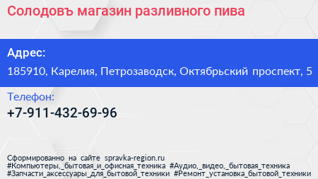 Солодовъ, магазин разливного пива по адресу 185910, Карелия, Петрозаводск, Октябрьский проспект, 5 в дальнейшем Организация, размещена в следующих категориях:
