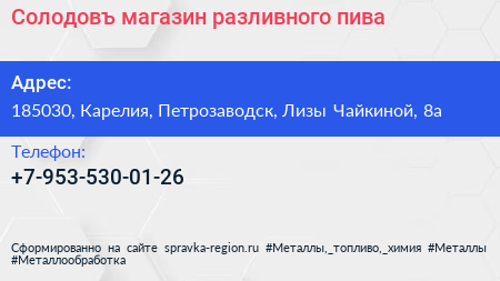 Солодовъ, магазин разливного пива по адресу 185030, Карелия, Петрозаводск, Лизы Чайкиной, 8а в дальнейшем Организация, размещена в следующих категориях: