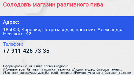 Солодовъ, магазин разливного пива по адресу 185003, Карелия, Петрозаводск, проспект Александра Невского, 42 в дальнейшем Организация, размещена в следующих категориях: