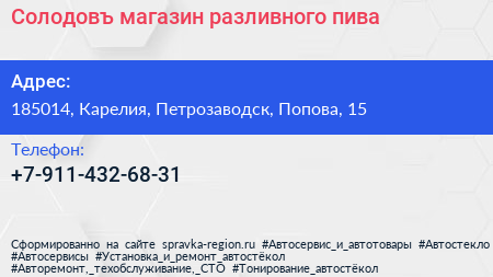Солодовъ, магазин разливного пива по адресу 185014, Карелия, Петрозаводск, Попова, 15 в дальнейшем Организация, размещена в следующих категориях: