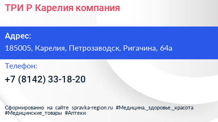 ТРИ-Р Карелия, компания по адресу 185005, Карелия, Петрозаводск, Ригачина, 64а в дальнейшем Организация, размещена в следующих категориях: