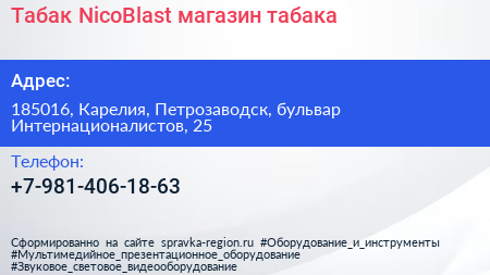 Табак NicoBlast, магазин табака по адресу 185016, Карелия, Петрозаводск, бульвар Интернационалистов, 25 в дальнейшем Организация, размещена в следующих категориях: